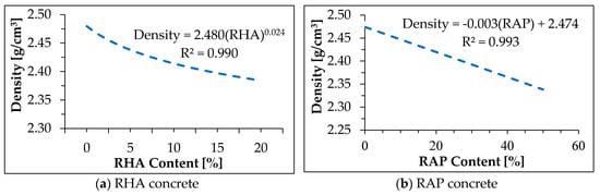 The fresh density of RHA-inclusive PCC decreased by 3.8% from 2480 to 2386 kg/m3 as the RHA content in the mix increased from 0 to 20%. The reduction in fresh density might be due to the fact that the particle density of RHA (2.03) was lower than that of cement particle density (3.12). The relationship between fresh density and RHA content (obtained by regression) is depicted in Figure 6a. R2 and SEE of the model were 0.990 and 0.008 respectively.