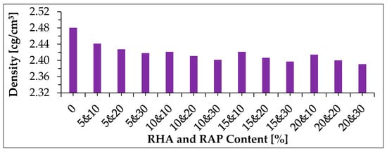 - The density of concrete decreased with increasing RHA and RAP content in the concrete mix.