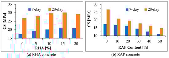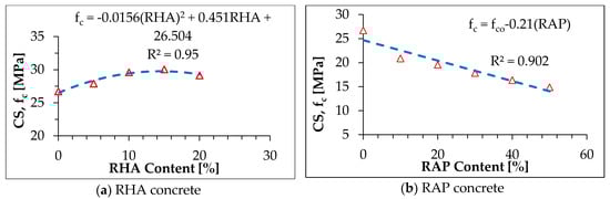 where: is the 28-days CS of the RAP-inclusive concrete in MPa; is the 28-days CS of the mix with no RAP content in MPa; and RAP is the reclaimed asphalt pavement content in %.