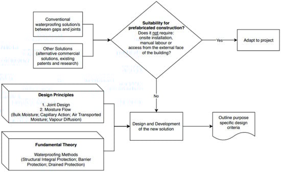 This research study expands on the processes which are currently greatly prefabricated to also include the façade, specifically the weatherproofing between façade panels, wall panels and modules. Currently the convention means of onsite weatherproofing of gaps entails setting up scaffolding to reach work height, manually pushing in a flexible foam backing rod and then manually applying a caulking/sealant generally silicone then manually tooling to achieve the correct profile are adopted for prefabricated panelised and modular constructions in filling the gaps between each wall or module [5]. This labour intensive primitive means of weatherproofing does not align directly with the values of efficiency in prefabrication. Quicker means of weatherproofing specifically designed for prefabricated panelised and modular type of construction and assembly is in order. Design and development of new solutions for purpose sake is only done when conventional or other solutions cannot suffice. To fuel design and development an understanding of the design principles and fundamental theory is required along with a purpose specific set of design criteria which are encompassing of the entire design, manufacturing and assembly processes [6]. To evaluate this need for design and development the flow chart in Figure 1 below is used and demonstrated in the following sections.