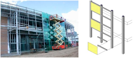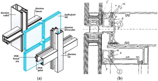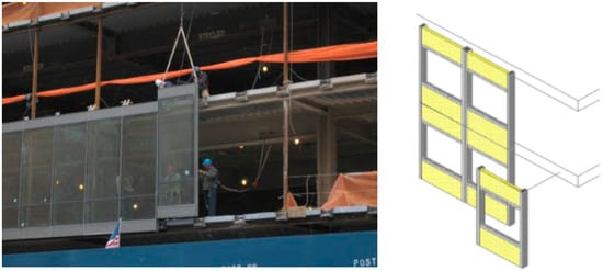 Unitized and Curtain-wall assemblies: (a) General Curtain Wall build up [14]; (b) Curtain-wall assembly in a modular construction system [15].