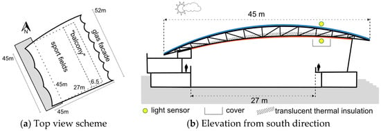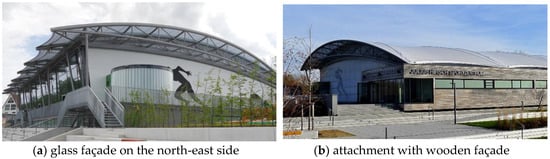 The building has a glass façade on the northeast side with the so-called indoor “balcony”, a 45 m × 27 m indoor field, changing rooms below the balcony and in the integrated attachment with the wooden façade. Figure 1 shows photos from the outside and a schematic top view is presented in Figure 2a. The rooms are arranged throughout the basement and ground floor while the sport field is located at the subterranean level of the basement, as shown in Figure 2b. The membrane roof spans the field and partly the secondary rooms. From an architectural point of view, the shape of the roof reminds of a sprinter on the starting block while the white membrane represents sportswear [33]. The light weight impression of the building appears adequate to the dynamic activities inside [33].