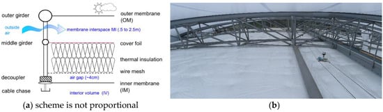 The scheme of the layer construction of the roof can be found in Figure 3a. It consists of an outer membrane (OM) as weather protection, a 0.5–2.5 m air space, a thin cover foil as humidity barrier, a thermal insulation, a small 4 cm air gap and the inner membrane (IM). The OM is walkable. A photography of the membrane interspace is shown in Figure 3b. A maintenance gangplank on the right side, the underside of the outer membrane at the top part of the image and the cover foil at the bottom part can be seen. The relevant properties of the roof construction and the glass of the façade are presented in Table 2. Most information was taken from the company datasheets. The total transmittance was measured as described in Section 2.2.