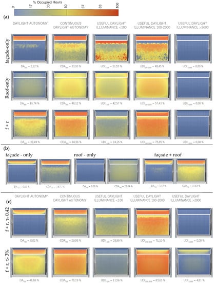 Increasing/decreasing the roof transmittance from 0.72% to 3%/0.47% changes the CDA in the 700 lx cases from the mentioned 38% to 70%/30% (Figure 5c and Table 7). The DA considerably changes from 1.5% to 47%/0%. The large transmittance of 3% (scenario No. 16) gives tremendous benefit for the daylight performance as also seen later in the electricity demand.