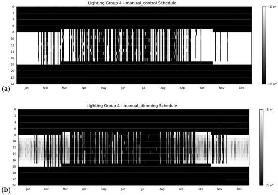 For the energy consumption of any automated system, the control behaviour is crucial. To interpret and transfer the results in this work to other situations, an understanding of the two used control modes is essential. As an example, for the operation of the control modes, two visualisations of the transient behaviour are shown in Figure 6. The users in “o/o” mode switch off the lighting with a certain probability if illuminance values above 300 lx occur. The dimming always dims the lighting following a photo sensor and the target illuminance value. Hence, the dimming mode in Figure 6b shows many times with partly operated light in grey colour.