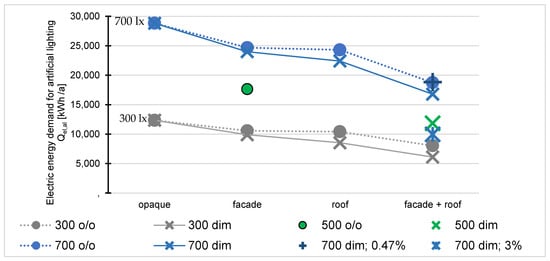 The approach of the varied parameters for the different scenarios is shown in Table 5. Properties of the building envelope, the target indoor illuminance, the lighting control and the transmittance of the roof component were varied. The 18 investigated variants are shown with all varied parameters in Table 6. There were two main groups of similar scenarios with target illuminance values of 300 (Nos. 1–7) and 700 lx (Nos. 8–14). As a step in between, two 500 lx variants were also calculated (Nos. 17 and 18). In addition, two scenarios with increased and decreased transmittance were considered (Nos. 15 and 16). According to the German standard DIN V 18599-10:2016-10, a sports hall should have a minimum target illuminance of 300 lx. In reality, artificial light is often used with higher target values so that scenarios with 500 and 700 lx are also tested. Overall, 700 lx is the realized situation in the case study building. Except scenario Nos. 15 and 16, the transmittance of the roof represents the clean surface case. No. 15 corresponds to the soiled surfaces and No. 16 to other materials with higher transmission. The user in lighting control mode “on/off” (o/o) switches the light statistically off when an indoor illuminance of 300 lx is exceeded. It is more than a time fixed schedule. This mimics a human operated situation. Dimming adapts the light power daylight sensitive to the target value. The target values also determine the installed lighting power (Table 5).