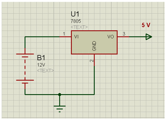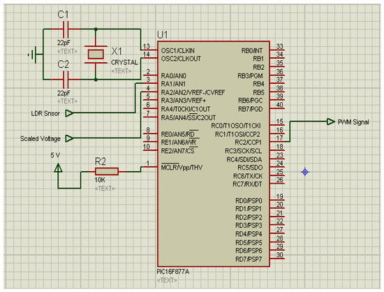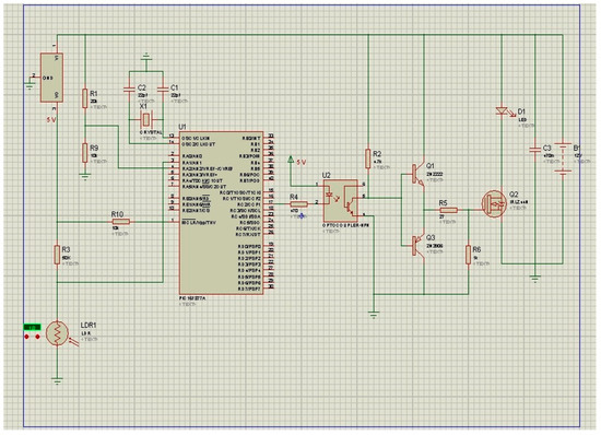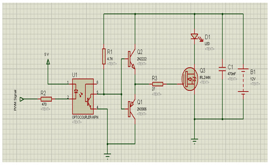 - Push–pull output: It is an electronic circuit that uses a pair of active transistor Negative-Positive-Negative type NPN (denoted by Q2 in Figure 9) connected to a positive voltage and a Positive-Negative-Positive type PNP (Q1) connected to a negative voltage. This circuit is used to enhance turn on–turn off for the Metal-Oxide-Semiconductor Field-Effect Transistor (MOSFET) and suppress the current spikes to enhance the operating conditions for the PWM signals generated by the PIC16F877A chip [23,24].