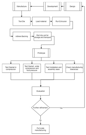The manufacturing process (which also involves assembly) is iterative and contains a lot of learning and feedback. As shown in Figure 4 initial manufacturing begins with the tooling of the initial die, it is important that at this stage that too much material is not taken out in the creation of the die for the proposed geometry as if tailoring on decreasing the size of the extrusion a whole new die is needed to be tooled whereas if an increase in size can be easily account for by tooling the existing die and removing more material. An additional consideration that may need to be accounted for is the complexity of the geometry along with the material which is to be used. Given that the material and the material temperature once heated results in a viscosity that is compatible with the complexity in the geometry then the material can be loaded into the hopper for meting and then pushed through the die to run the extrusion, there may be some iteration here however once the parameters are set they can be easily maintained. The extrusion which set as it formed through recirculated water cooling the extrusion is dried and the adhesive backing is adhered. One side of the double tape adhesive is peeled and applied whist the other is kept intact and the extrusion which is now the gasket is made from EPDM rubber it can be rolled into coils for storage and transport. This forms the basis of the initial gasket prototype which will be then subjected to several tests. The first such test was the compression of the gasket whilst checking for deformation profile and for the force required to compress the gasket to the designed level. This is an important test to do as it validates the finite element model and confirms the expected behavior so that there will not be an issue on site when the panels are place such that the gasket will compress appropriately. Next a test for ease of installation which is be the manual unpacking and handling the coil, striping the backing tape and application of the gasket to the edge of the wall closest to the exterior face is done. Now that it has been established that the gasket can be installed on the wall to a controlled level of precision with ease and can be compressed by the expected amount of force then the next test is the compression and checking for water leakage under fluid pressure. This test is vital to the performance of the gasket seal in waterproofing, once again the results are compared to that of the finite element model and to the minimum requirements as outlined in the relevant standard. Finally testing the manufacturing tolerances through accurate measurements and applying them the each of the tests particularly the deformation profile, force based on compression and check for water leakage under compression so as to establish confidence in the robustness of the solution.