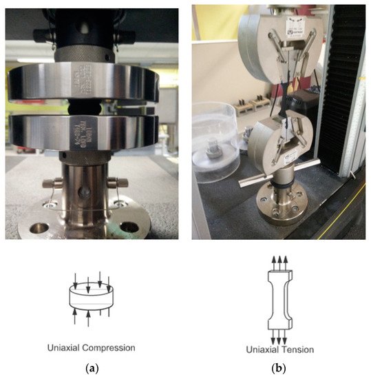 Acquiring the properties of rubber which as common material for gasket type seals is important to understand and additionally significant in the fact that this it will be imported into a numerical model to simulate the seal, thus the accurate capturing of this data is crucial to the accurate modelling of it. The relevant codes have been found to be: ASTM D575 (2018) Standard Test Methods for Rubber Properties in Compression [19], ASTM D395 (2016) Standard Test Methods for Rubber Property—Compression Set [20] and ASTM D412 (2016) Standard Test Methods for Vulcanized Rubber and Thermoplastic Elastomers—Tension [21]. Photographs of the tests carried out are shown in Figure 5a,b below.