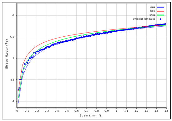 The Neo-Hookean model can be useful in prediction of behaviour of elastomers and assumes perfect elasticity through the stages of deformation and can capture non-linear stress-strain relationship. However due to the fact that polymer chains under stress can initially move relative to each other but at a certain stage covalent cross links limit this and hence in turn increased the elastic modulus at this stage, the results is that the Neo-Hookean model is best suited for strains below this level [15].