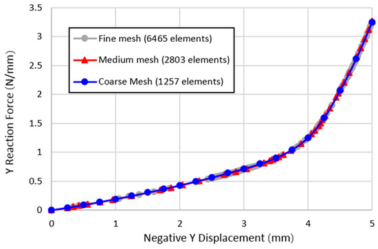 Y reaction force vs Negative Y displacement for three different mesh configuration.