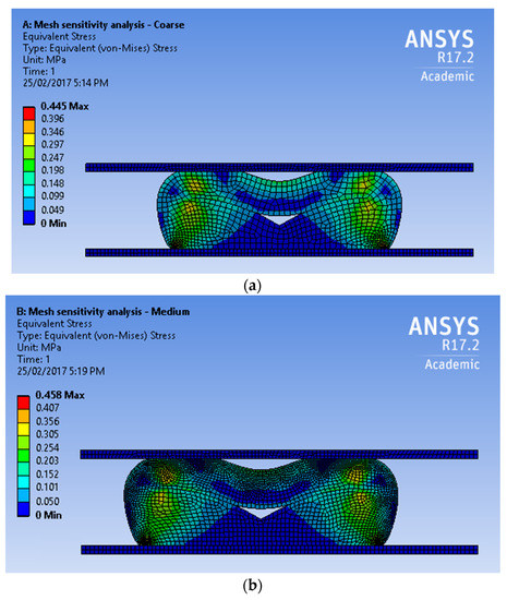 A mesh sensitivity study is performed in order to obtain an optimal mesh configuration that produces accurate results at low computational cost. Three mesh configurations of increasing refinement are generated, and key results (reaction vertical force in Figure 8 and element stresses in Figure 6) are compared for the three mesh configurations as shown in Figure 9a–c.