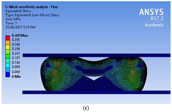 Geometry of the gasket seal after compression for identical loading cases: (a) Mesh A; (b) Mesh B; (c) Mesh C.