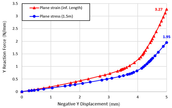 As expected, the plane stress assumption resulted in lower vertical load required to achieve a displacement of −5 mm (1.95 N/mm vs. 3.27 N/mm). The difference in loading between the plane strain and plane stress assumption is significant (40%).