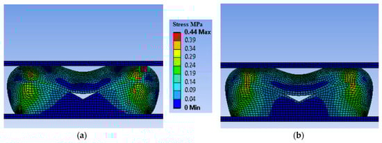 Contour plot of equivalent stress for simulations: (a) Plane Stress Assumption; (b) Plane Strain Assumption.