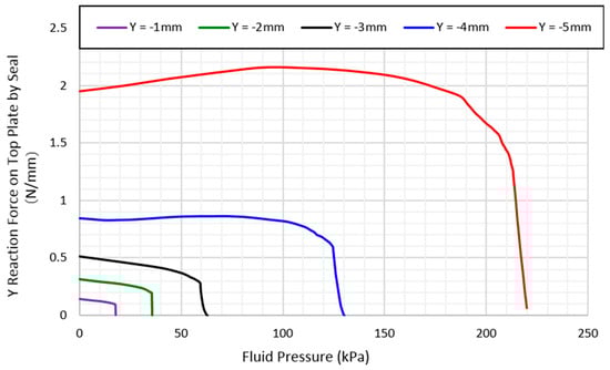 Figure 13 shows the performance of the rubber seal with increased fluid pressure. The y-axis represents the reaction force or the top façade from the rubber seal. A value of zero on the y-axis indicates that the seal has fully separated from the top plate, allowing for fluid to leak through.
