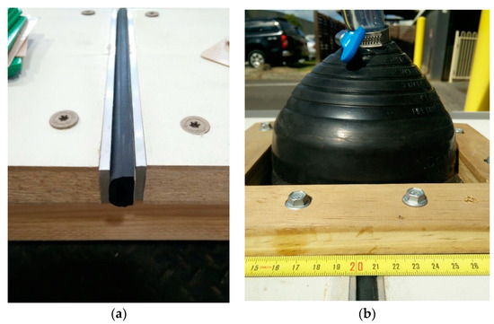 Figure 15a shows the EPDM rubber gasket seal adhered to aluminium strip via tape adhesive and then sandwiched to the desired compression via the use of packers for measurement. Figure 15b shows a rubber boot seal is applied to the surface of the adjoined panel with waterproof silicone between the two members, this is then compressed and held tightly via screwed timber batons.