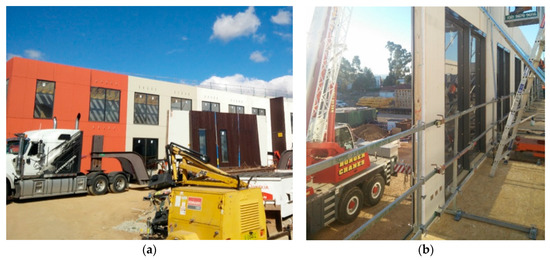 Implementation with panelised form of prefabricated construction: (a) Commercial office building using the gasket seals; (b) EPDM gasket seal positions on the wall towards the outside face.