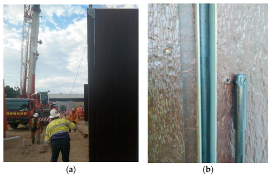 Lifting and placement of panels: (a) Complete prefabricated wall panels are lifted and place into position whilst compressing the rubber gasket; (b) Due diligence in measurement of gap width and assessment of shape and embedment depth.