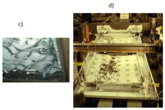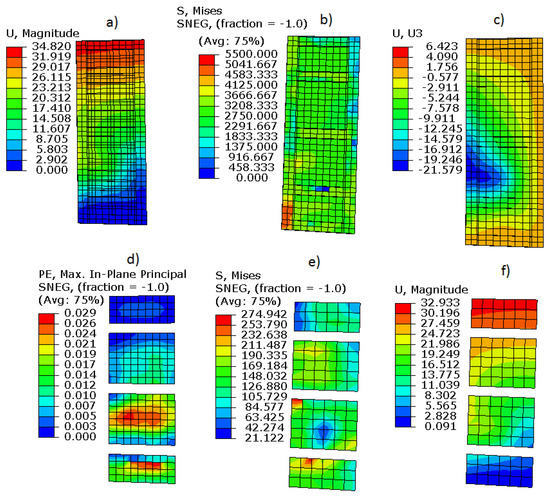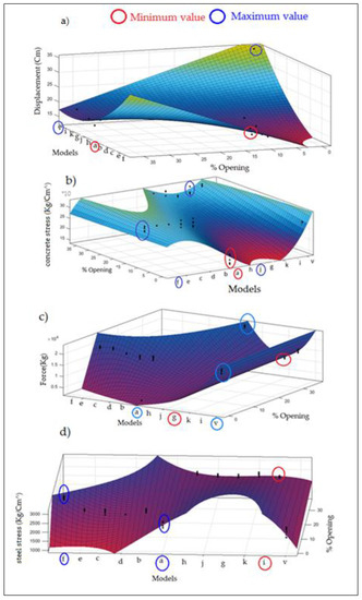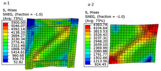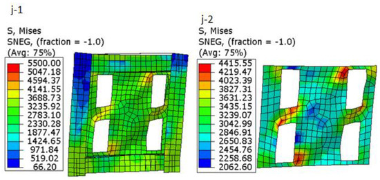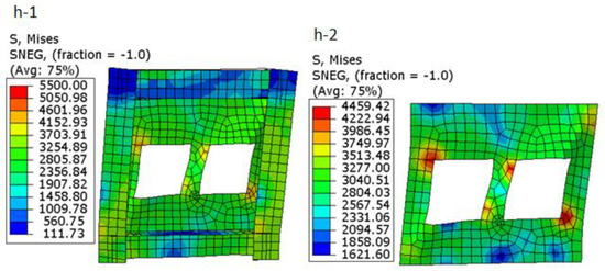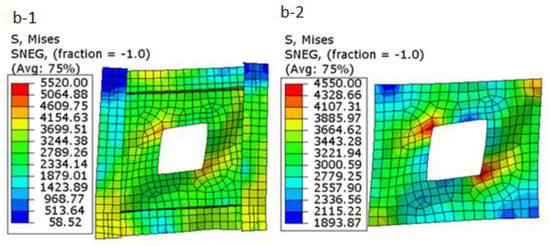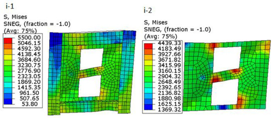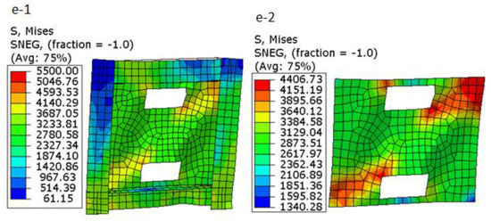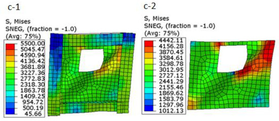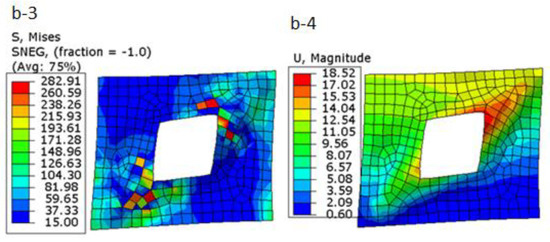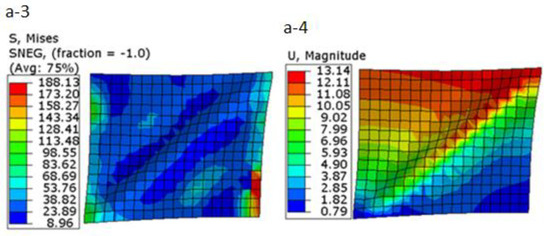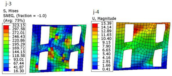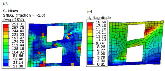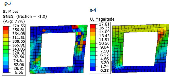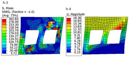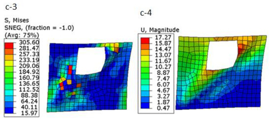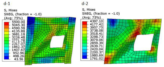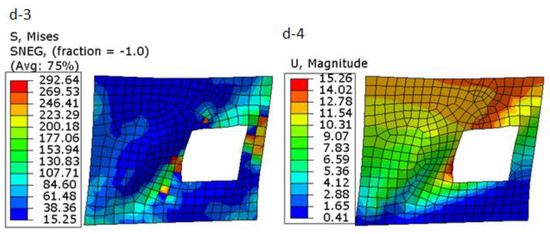 - In total, the performance of models (c) and (d) is similar to each other, but the number of elements reaching the ultimate stress in model (c) is higher than in model (b), so model (b) has the worst performance among all models in this group due to maximum displacement. Moreover, the number of elements reaching the ultimate stress are higher than others. In the following, Figure 9, Figure 10, Figure 11, Figure 12, Figure 13, Figure 14 and Figure 15 show the stress and displacement for models 4 to 6.