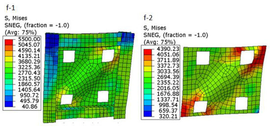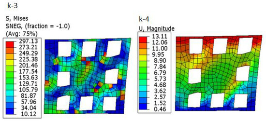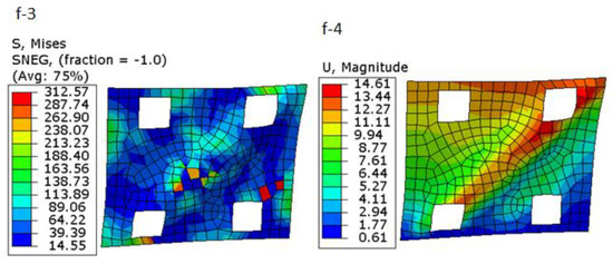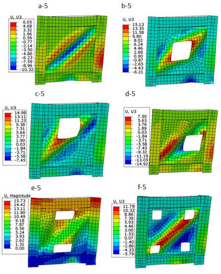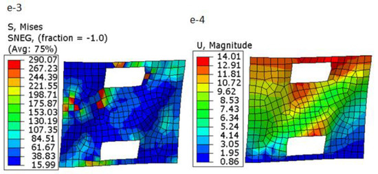- Figure 16, Figure 17, Figure 18 and Figure 19 show displacement, concrete and steel stress for models e and f. Figure 16 and Figure 18 show that the maximum stress in the steel plate in specimens with 4 openings is 439 MPa, which depicts the stress decrease as compared to model (e). Moreover, the stiffness of the shear wall increases with distributing opening.