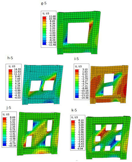 - The number of elements reaching maximum stresses around the opening near the beam was more than specimen with an opening near to column. The reason for the larger stress around the opening near beam as compared to the opening near column or central opening can be related to the out-of-plane displacement. When comparing the displacements in the two specimens, as shown in Figure 20, the displacement around the opening near the beam is larger than the opening near the column.