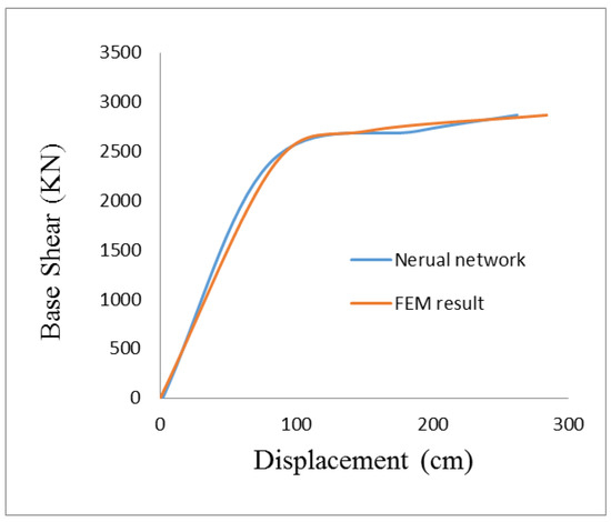 - By increasing opening’s size, the strength and stiffness of the composite shear wall decrease, and the opening position affects the reduction level in the wall stiffness, such that the average of stiffness reduction is 60% for group B, however this value is 80% for group A. Steel stress, displacement and concrete stress are similar to the state where the opening size is 10%. As clearly shown in the neural network result (Figure 23, Figure 24, Figure 25, Figure 26 and Figure 27) and FEM result, the variation of strength and stiffness are 0.39% for the case where opening size is 36%; however, this value is 11% for the case where opening size is 10%. Therefore, as compared to specimens in group A, strength and stiffness variation is more intense for models in group B and changing opening place and opening size has strong influence on the composite shear wall stiffness.