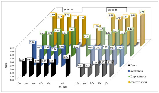 - In group B, by moving openings near to the beam, the strength and stiffness of the wall increase 39% as compared to the central opening and this action does not have any fundamental impact on the steel and concrete stress. Therefore, this model has the best performance in this group, because the opening is near to the diagonal pattern and model g has the worst performance as compared to others due to its opening location.