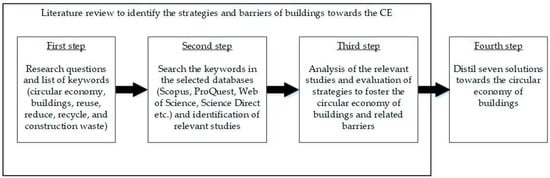 Methodology divided into four steps: research questions and list of keywords, identification of relevant studies, analysis of the studies to discover strategies and barriers toward the circular economy of buildings, and proposal of seven possible solutions.