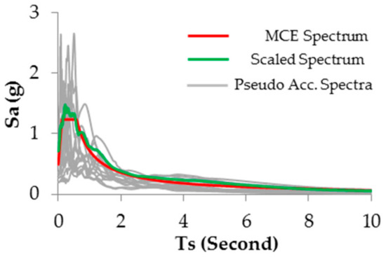 Inspired by FEMA P-751 section 12 [42], a set of seven ground motion records which suit the site hazard conditions were selected from the FEMA P-695 database [35] and used in the design process. Calculating the Square Root of Sum of the Squares (SRSS) and computing the average spectrum, the pseudo acceleration spectra of the ground motion records, the ASCE 7-2016 risk-targeted design spectrum, and the scaled spectrum are illustrated in Figure 5.