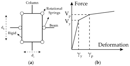 A Finite Element (FE) code was developed in the OpenSees platform [47] to numerically simulate the 3D buildings. Effect of nonlinearity in both material and geometry were included in the FE code. Geometry and material nonlinearity were implemented by using P-Delta transformation and simulating plastic hinges at the ends of each beam-column element, respectively. Modified Ibarra–Medina–Krawinkler deterioration regime with bilinear hysteresis response was assigned to the plastic hinges [48]. Although the seismic isolation can decrease the superstructural nonlinearity, the behavior of panel zones was already taken into the account. The panel zones including a scissor model with nonlinear backbone curve were simulated as demonstrated in Figure 6a. Using rigid elements to simulate the actual size of the panel and introducing a trilinear behavior for rotational springs, the corresponding force-deformation is illustrated in Figure 6b using Equations (4)–(7) [49].
