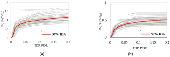 Forty-four ground motions (22 pairs) of far-field earthquakes addressed in FEMA P-695 [35] are used to perform the IDA. The IM-EDP curves corresponding to the models #2 and #22 are illustrated in Figure 7, as two examples.