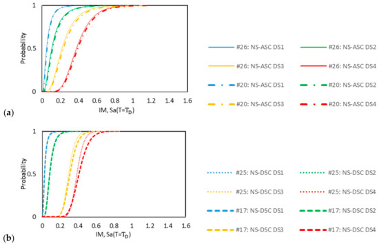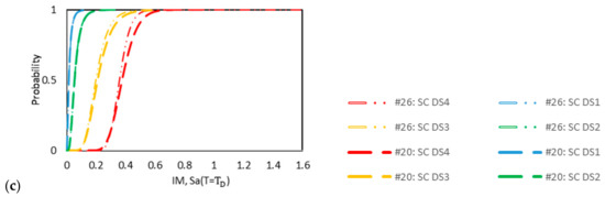 Fragility curves of model #20 (LRB) and model #26 (TCFP): (a) AS-NSC, (b) DS-NSC, (c) DS-SC.