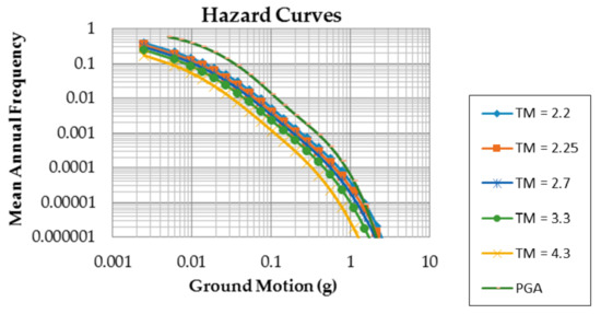 To take the RTR variability into account and neutralize the structural specific characteristics, the n–year probability of occurrence of a certain DS was calculated and denoted as “the risk of the DS”. The fragility curves corresponding to the DSs were integrated over the site hazard curves using the total probability theorem. Thereby, the mean annual frequency corresponding to the specific DS (λDM) was computed following Equation (9).