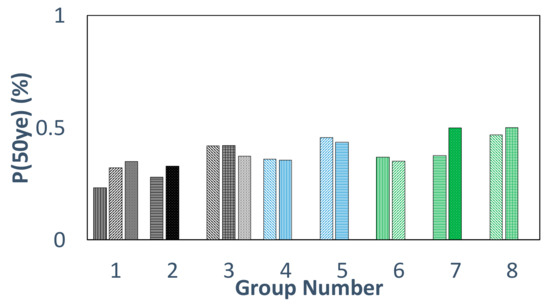 The changes in Teff do not significantly affect the risk of damage to the DS-NSC (Figure 21) and DS-SC (Figure 22), except the groups #1, #7, and #8, where the risk of damage is increased by having a longer Teff, especially in lower DSs. In fact, a longer Teff can potentially reduce the seismic design load. Consequently, the section size of superstructures becomes smaller and it is more probable for the superstructure to reach to a specific DS in lower seismic intensities. In this regard, the structure which has longer a Teff experiences a greater risk of damages to DS-NSC, as well as DS-SC, than the others. It is very important to mention that this increase in the risk values will happen only if the TD controls the seismic design force. In other words, the amount of design force (Equation (11)), must exceed the design requirements per Section 17.5.4.3 of the ASCE/SEI 7-2016. Otherwise, any change in the TD does not cause significant variations in the seismic risk of damage.