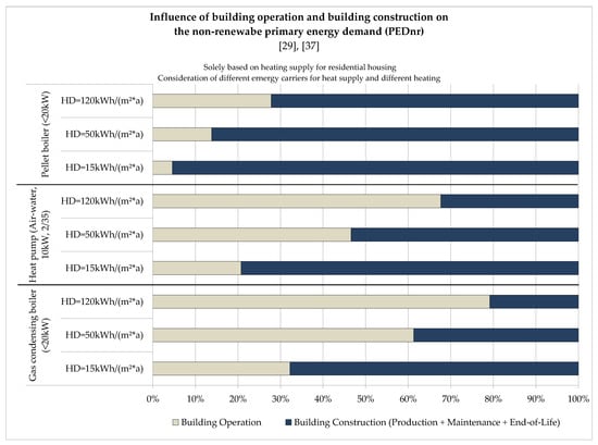 Influence of building operation and building construction on the non-renewable primary energy demand (PEDnr), solely based on heating supply for residential housing, different energy carriers (gas, district heat, wood pellets), and different heating energy demands (own depiction referring to [,]).