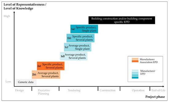 Figure 2 furthermore maps the types of environmental datasets and their application in different building project phases based on representativeness and uncertainty in informational content []. It illustrates when environmental information from the Ökobau.dat might be used to be as precise as possible within environmental assessments. In early project phases (design, planning), generic datasets should be used due to an often very limited level of knowledge. Most important technical data that are present may be the building cubature, an idea of the overall constructional design (glass structure, light-weight, solid) and first energetic calculations (e.g., according to German energy saving regulation (EnEV) for buildings []). Within the tendering phase, details on constructional structures are available, even if specific products are not yet known. EPD data from manufacturer associations (2a and 2b) might be used to generate a much more accurate building LCA result. Within the construction phase these associations’ information may be exchanged with manufacturer specific or average product information (1a to 1d), as all building products are known after completion. A specific building LCA result, including materials and products as in-built is the consequence. In that way, Ökobau.dat provides for environmental information on different levels (generic, manufacturer association specific, product specific) and enables for building assessment in different project phases even today.