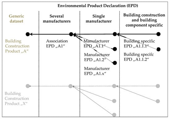 Unlike generic datasets, environmental product declaration (EPD) datasets are based on primary data from manufacturers or groups of manufacturers (associations). Ökobau.dat distinguishes verified EPD data according to DIN EN 15804 that are set up within an EPD program under operation (according to DIN EN ISO 14025 []) and that are set up without such a program. They undergo verification by an independent external review. Safety margins of 10% are applied on environmental information provided from cross-industry life cycle assessment studies or when only representative products or sample formulations are declared by several manufacturers. EPD information is divided into product specific and average product information. Furthermore, a distinction is made between data obtained from a single plant or from several plants (Figure 2, 1a to 2b).
