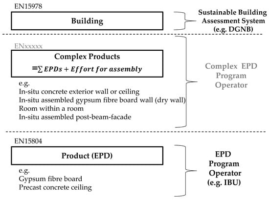 The before mentioned Working Group “InData” (see Section 2) brings together EPD program operators, dataset and data base providers, data format developers, and building assessment operators. Apart from the definition of a common standard for the data format, compatibility, and transparency of environmental data is one of the focus areas of this network [].