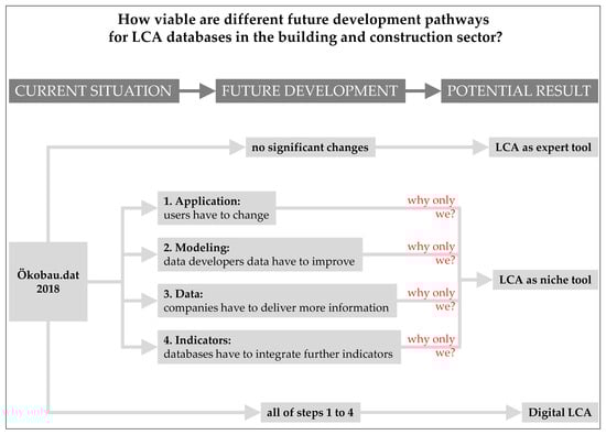 Due to current developments in the building construction sector, such as the strong reduction of the building energy demand [,] and the forthcoming of Building Information Modeling (BIM) [,], todays’ LCA practitioners question if these LCA data sources are sufficiently viable and adaptable for the future. At the specific example of the German “Ökobau.dat” as one of the leading European LCA construction product databases, this publication discusses whether the database is able to address forthcoming structural, application, content, and scientific related developments in its current form or how it would have to be evolved to do so. For this purpose, the origin of the German database is explained shortly. Furthermore, the main important current developments the database has to face are described and strengths of the present database are pointed out. On this basis, a detailed analysis of current shortcomings within the German database is presented with regard to end user application, content, modelling, and automation, as well as the update process. For these shortcomings solutions are proposed that could support its development in a viable and future-oriented way. Afterwards, the outcomes of this specific analysis, their implications, and their transferability within the context of other international construction databases are discussed. Finally, the summary and outlook concludes with different future pathways for development for LCA databases in the building and construction sector.