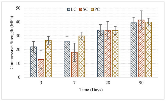 Figure 1 shows that three-day and seven-day compressive strengths of concrete samples produced using SC cement with the lowest clinker ratio was approximately 20 MPa. 28-days compressive strengths of concrete samples produced using SC cement were not significantly different from the other concrete types. As pozzolanic reactions take place by the 90th day, the compressive strength of the concrete samples produced using SC cement was approximately 50 MPa. Three-day and seven-day compressive strengths of concrete samples produced using LC cement were lower than that of the concrete samples produced using PC cement. Approximately 10% strength loss was observed in early-age strength of the concrete samples due to the decreased clinker ratio used. However, this loss was eliminated on the 28th and 90th day and it was found that concrete samples produced using PC and LC cements had similar properties. Although limestone does not offer pozzolanic properties, it offers the same performance as PC cement due to nucleation’s contribution to hydration and acts as a filler. Concrete samples produced using PC, i.e., the reference cement, offered high compressive strengths on all the testing days. Compressive strengths of all the concrete samples increased with the increase in curing time.