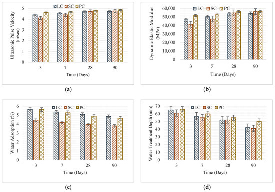 Figure 2 shows the effect of cement type on some hardened concrete properties. As shown in Figure 2a, UPV values increased with the increased curing time. UPV values increased as compressive strengths of concrete samples increased. Three-day and seven-day UPV values of concrete samples produced using SC cement were in the range of 4.10–4.41 km/sec. UPV values of concrete samples produced using SC cement was equal to those of the concrete samples produced using PC cement when the curing time was increased. UPV values of concrete samples produced using LC and PC cements offered similar properties up to the 28th day (4.40–4.80 km/sec). On the 90th day, pozzolanic reactions in SC cement played a role in the increasing UPV values. Figure 2b shows the change in dynamic elasticity modulus (Ed) due to cement type. The three-day Ed value of the concrete samples produced using SC cement was 41,455 MPa, while this value was increased by 35.9% on the 90th day to add up to 56,366 MPa. Such an increase in Ed value can be accounted for by the improved microstructure thanks to pozzolanic reactions, which has a positive impact on the compressive strength. Ed values of both LC and PC cements increased with an increased curing time. The differences between the Ed properties of LC and PC cements were not significant on the 28th and 90th day. Figure 2c shows the water absorption ratios of concrete samples produced using different cement types over time. Water absorption ratios of concrete samples produced using LC and PC cements after three days of curing were approximately 5.6%. However, water absorption ratios of concrete samples produced using LC and PC cements after 90 days of curing were approximately 4.7%. Water absorption ratios of concrete samples produced using SC cement were lower than those of concrete samples produced using LC and PC cements. The water absorption ratio of concrete samples produced using SC cement was approximately 3.80%. Figure 2d shows the water penetration depths of concrete samples produced using different types of cements. Increased curing time resulted in decreased water penetration depth. Water penetration depths of concrete samples produced using SC and LC cements were similar on the 28th and 90th day. The fact that LC and SC cements had higher Blaine fineness values reduced the water penetration depth.