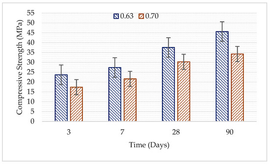Figure 3 shows the compressive strength of concrete produced using different w/c ratios over time. As shown in Figure 3, decreased w/c ratio results in increased compressive strength at all testing days. Compressive strength is reduced by 26.5% and 21.1%, respectively, on the third and seventh day as a result of the increase in w/c ratio from 0.63 to 0.70. The same ratio was found to be 19.4% on the 28th day. Although the loss in compressive strength due to w/c ratios was reduced up to the 28th day, the loss in compressive strength on the 90th day was found to be 24.9%. This significant difference between w/c ratios can be accounted for by the pozzolanic reactions. Moreover, very high w/c ratios had a negative impact on the pozzolanic reactions.