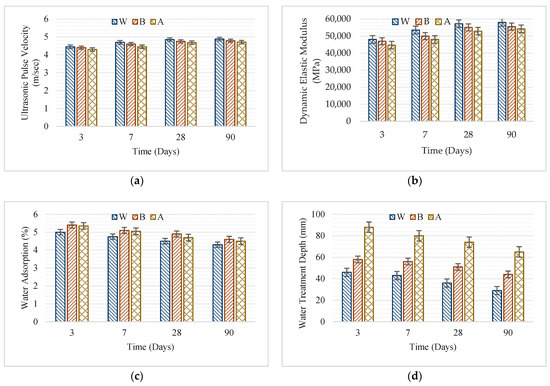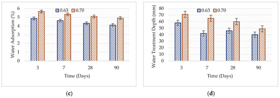 Figure 4 shows some hardened concrete properties of the concretes produced using different w/c ratios. As expected, the experiment results showed that decreasing the w/c ratio increased UPV and Ed values (Figure 4a,b). Nevertheless, decreasing the w/c ratio also decreased water absorption and water penetration depth (Figure 4c,d). It was observed that the water penetration depth was reduced to 40 mm in concrete samples produced using a w/c ratio of 0.63, while this value was 50 mm in concrete samples produced using a w/c ratio of 0.70. The change in w/c ratio did not have a significant effect on UPV. The difference between UPV values was reduced, especially with the increasing curing times.