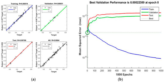 Regression values for the ANN model. (a) Regression Values; (b) MSE Values.