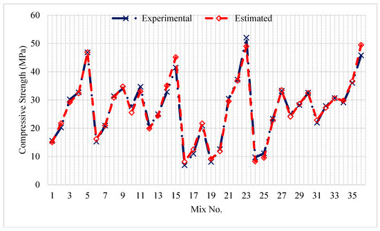 Forty mixes were selected in order to create a simulation of the ANN model developed and model’s ability to estimate was explored. As shown in Figure 9, the model was quite successful in estimating the compressive strength values. This is a further confirmation of the fact that the ANN structure was modeled smoothly. The values of the error measures (RMSE-Root Mean Squares of Error and MAE-Mean absolute error) of this model for training, validating and testing datasets are given in Table 4.