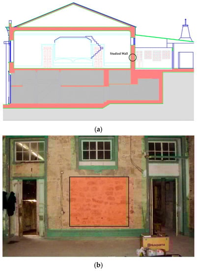 A 50 cm thick interior load-bearing wall, located in the main hall and parallel to the main façade, was studied in this building, Figure 5a. As can be seen in Figure 5b, stone masonry was visible without the need to remove any plaster. The masonry consists of gray granite stones, with both rectangular and square shape, and cream color mortar. In general, a length of around 70 cm, for the biggest rectangular stones, and around 20 cm, for the square ones, can be observed. Rectangular stones present a length/height ratio of approximately 3. The presence of wedges was not significant.
