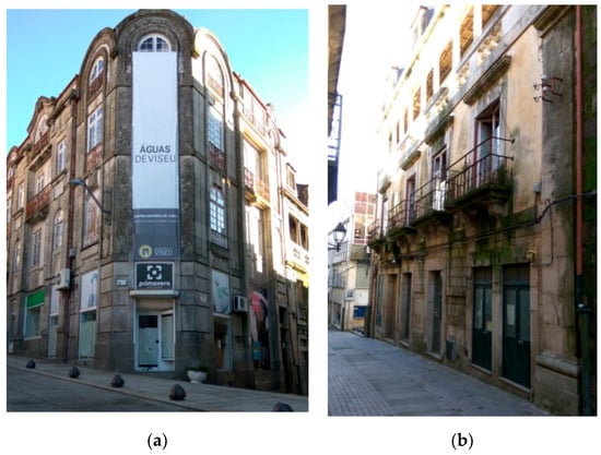 Águas de Viseu: (a) view to Rua do Comércio; and (b) view to Rua D. Duarte.
