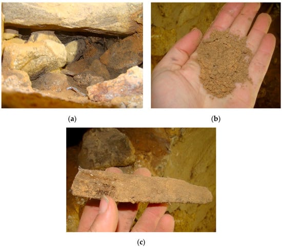 The wall was found to be composed of two leaves, with an interior non-cohesive core (sacco masonry). Both the interior leaf and the inner core are 25 cm thick. It was not possible to measure the outer leaf thickness, but a 25 cm thickness is equally plausible. A total thickness of 75 cm, at ground level, would then be expected. Regarding the inner core, it was possible to observe that the wall was filled with roughly-shaped granite stones of about 10–15 cm long, laid in a random manner (Figure 9a), linked by lime mortar and earth (Figure 9b). Some small wooden elements, such as wood splinters, were also found in the inner core of the masonry wall, see Figure 9c.