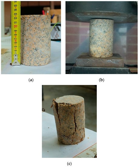 Figure 10 presents the test sample, the test procedure and the final appearance of the sample after tested. The results obtained in the compressive test are presented in Table 1, where L, D, m and γ stand respectively for the length, diameter, mass and specific weight of the test specimen and fcb is the maximum compressive strength recorded in the compressive test.